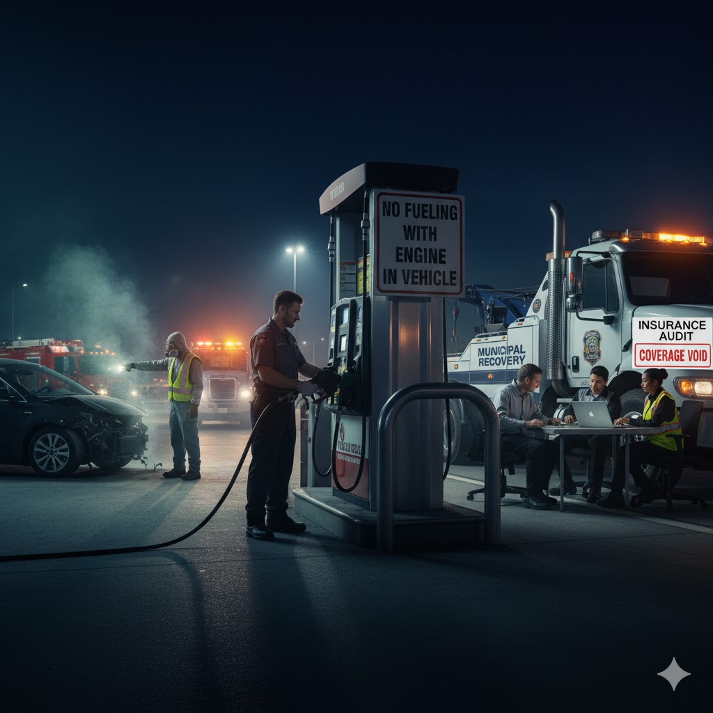 - Fueling restrictions. Company and local fire codes may prohibit fueling with engine running or while occupants remain in the cab; some facilities also restrict fueling with boom/bed extended. Build this into SOPs.