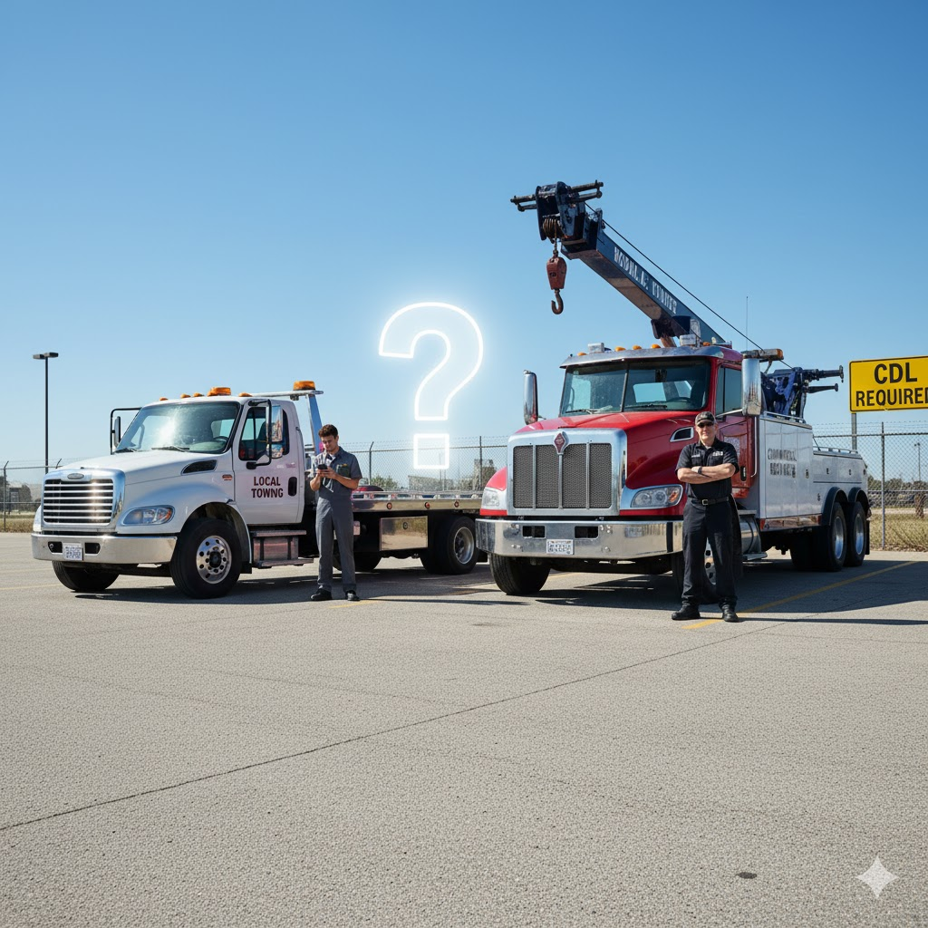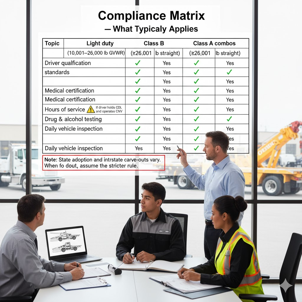 A common misunderstanding: “No CDL means no big-rig rules.” Not so. Once your tow truck is a commercial motor vehicle in commerce (often >10,001 lb GVWR), you pick up significant obligations.